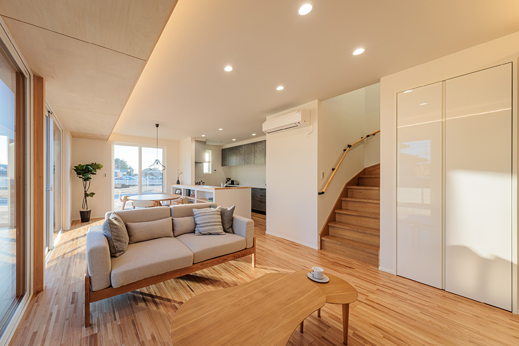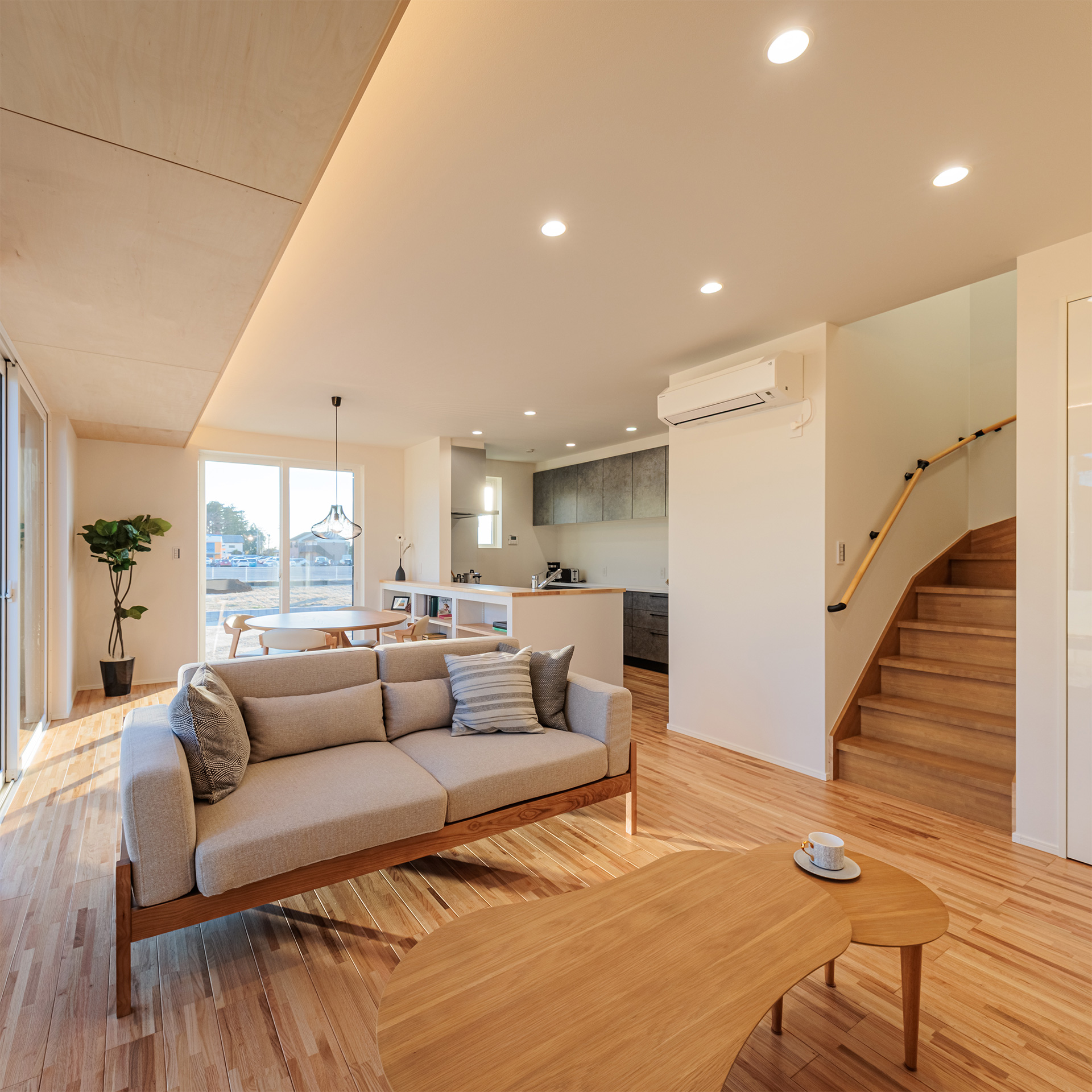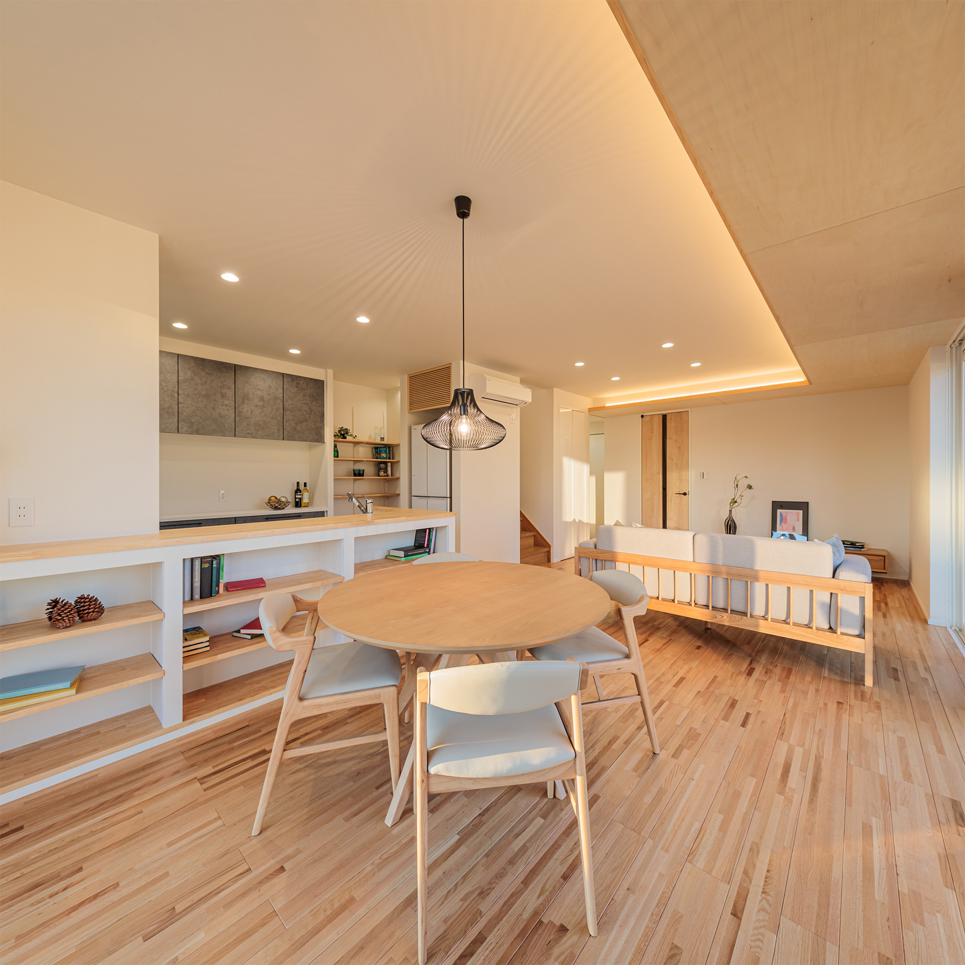 シナベニヤの下がり天井 木目のやわらかな風合いが空間を優しく包み、柔らかな照明とともにリビング・ダイニングにあたたかさと安らぎをもたらします。