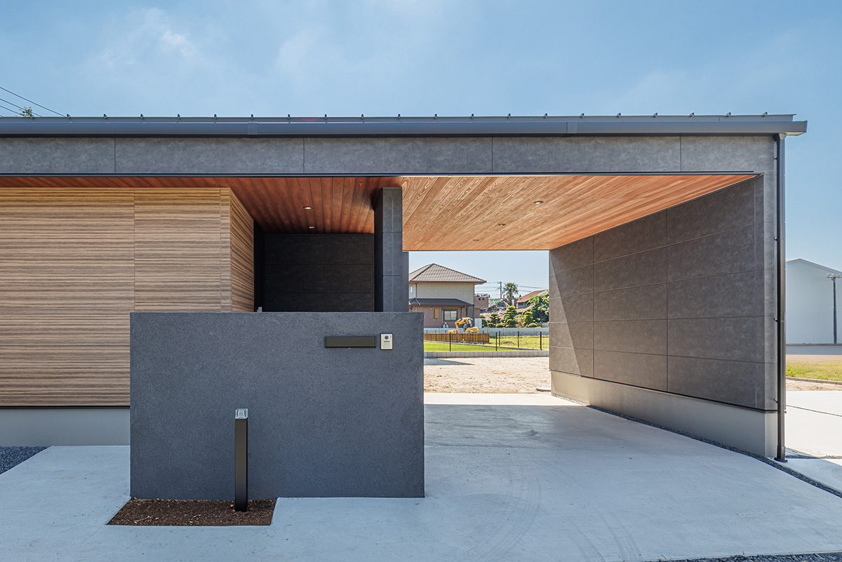 軒下とポーチ天井に無垢材を張り、外壁とのコントラストを際立たせています。 車 1 台分の屋根付きスペースは雨の日も濡れずに出入りでき、愛車の手入れや子どもの外遊びにも活躍します。