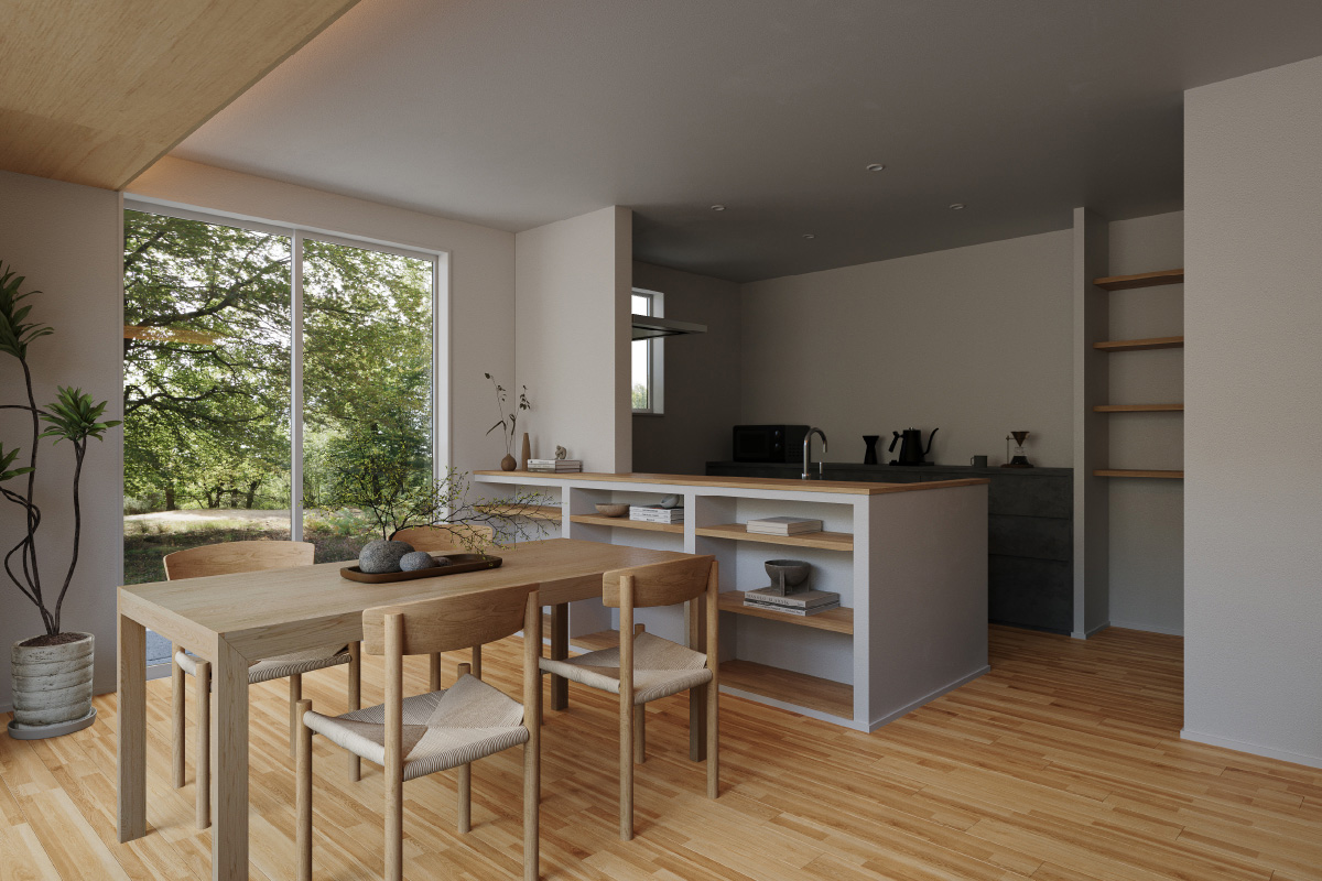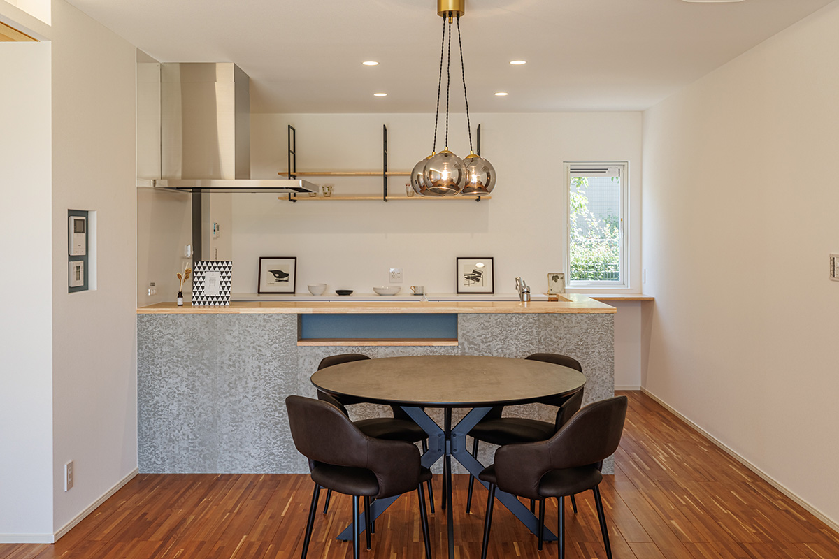 キッチン腰壁には石目調のパネルを使用。幅の広い無垢材のカウンターは、リビング・ダイニングをゆるやかにつなぎ、配膳や後片付けもスムーズです。
