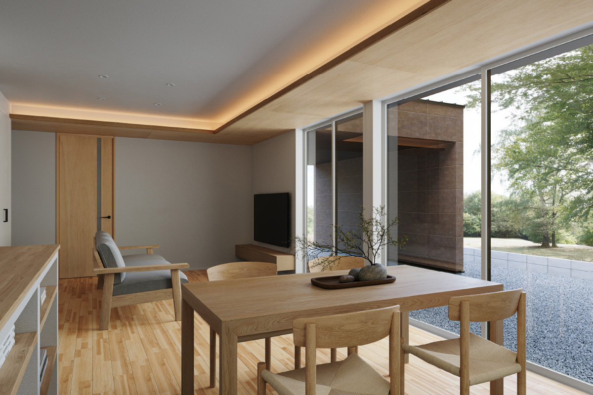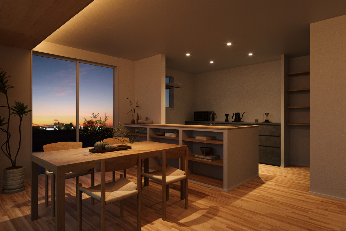 木目のやわらかさで空間をぐっとあたたかく演出。 照明との組み合わせで、リビングやダイニングがまるでカフェのように居心地のいい雰囲気に。 シンプルな中にも木の表情が生きるデザインです。