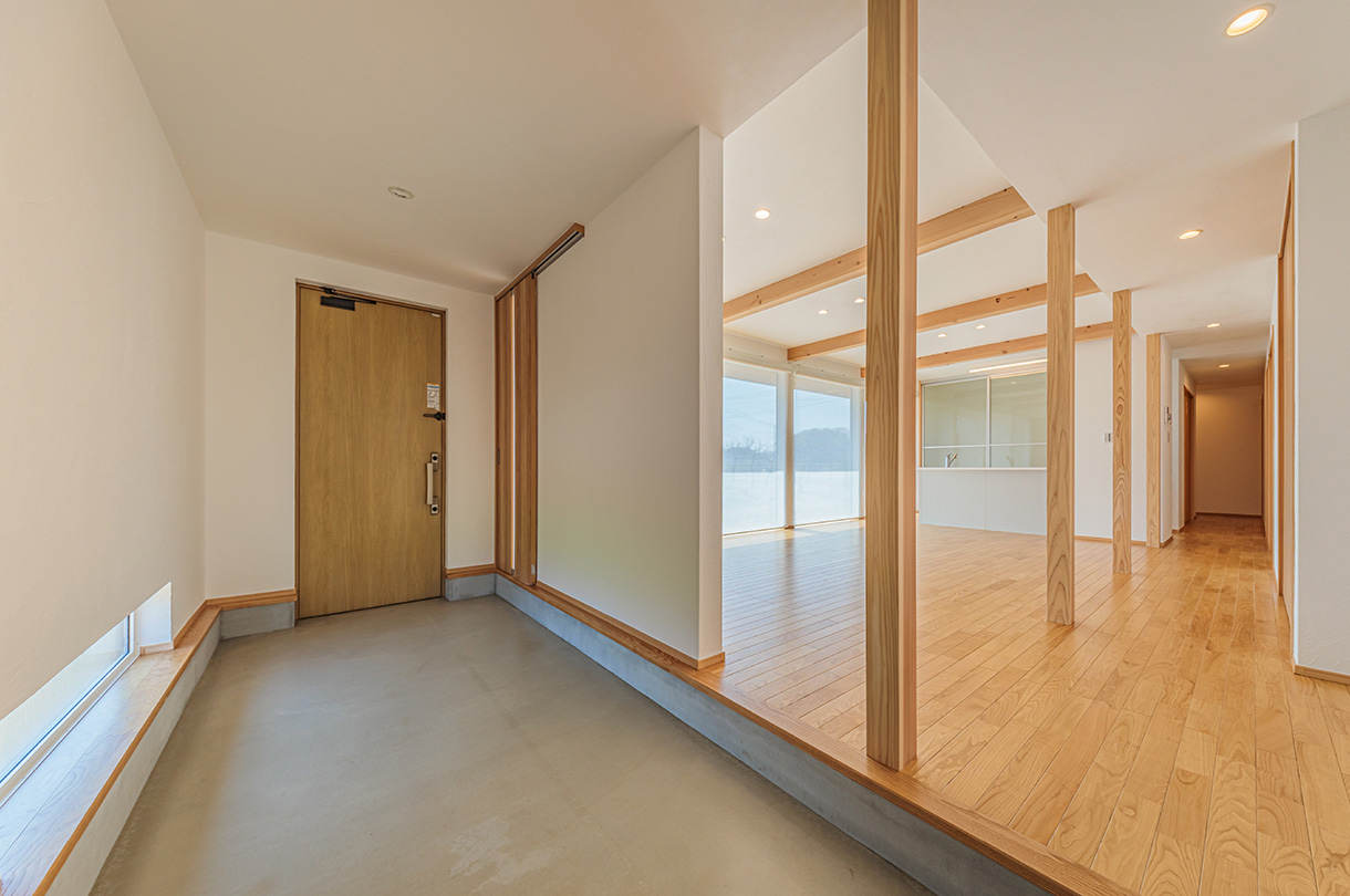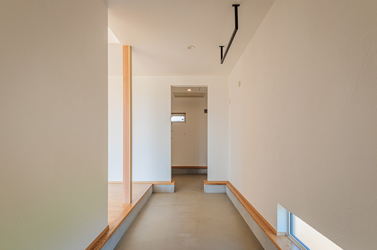 玄関ドアを開けると、土間がまっすぐ奥まで続きます。玄関ドア側の入り口は大開口のリビング、クローク側からは廊下を経て各部屋へ。壁で仕切らず、柱と段差だけで空間をゆるやかに分けることで、家のどこにいても同じ空気が流れるつながった暮らしが生まれました。