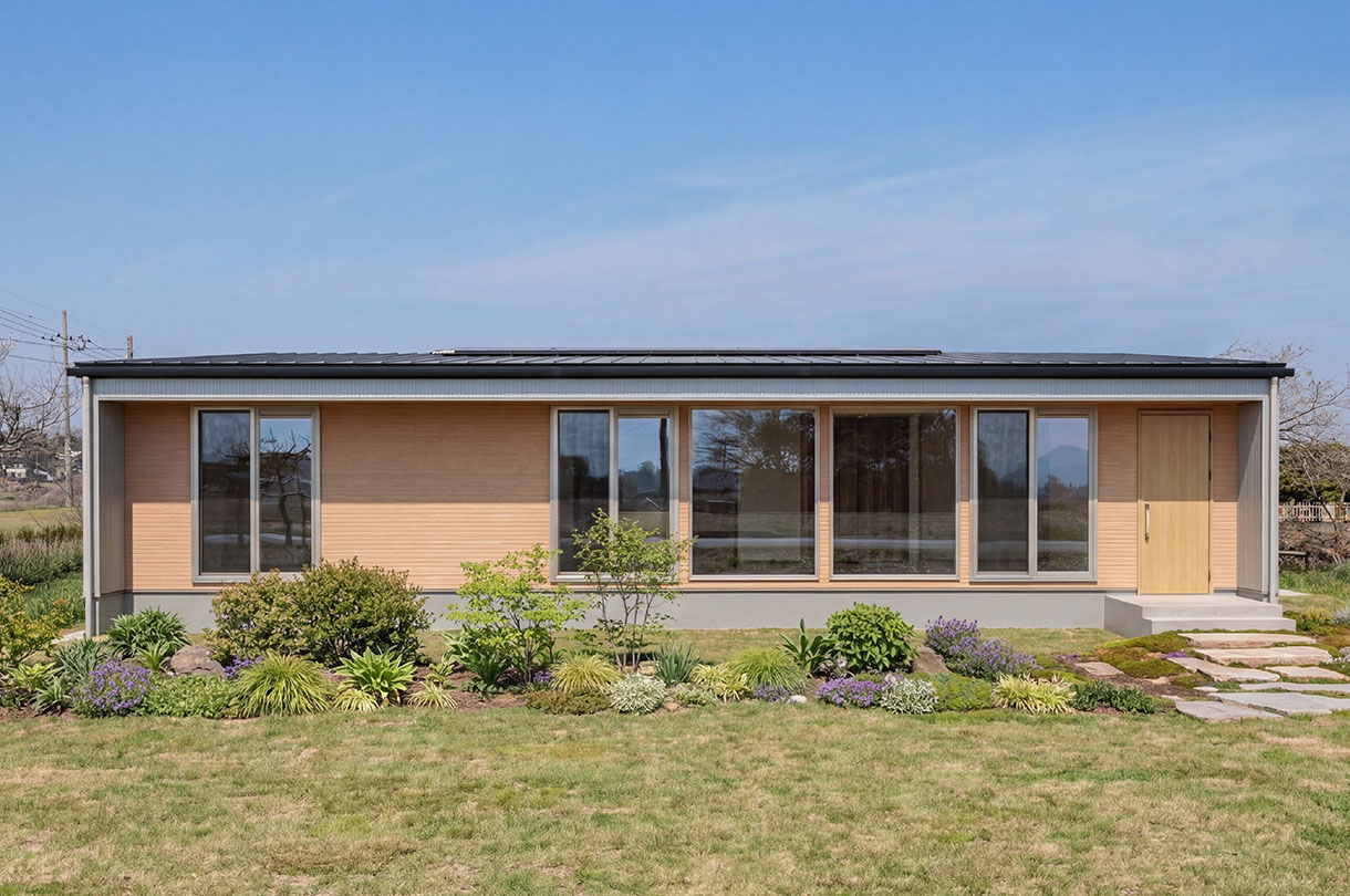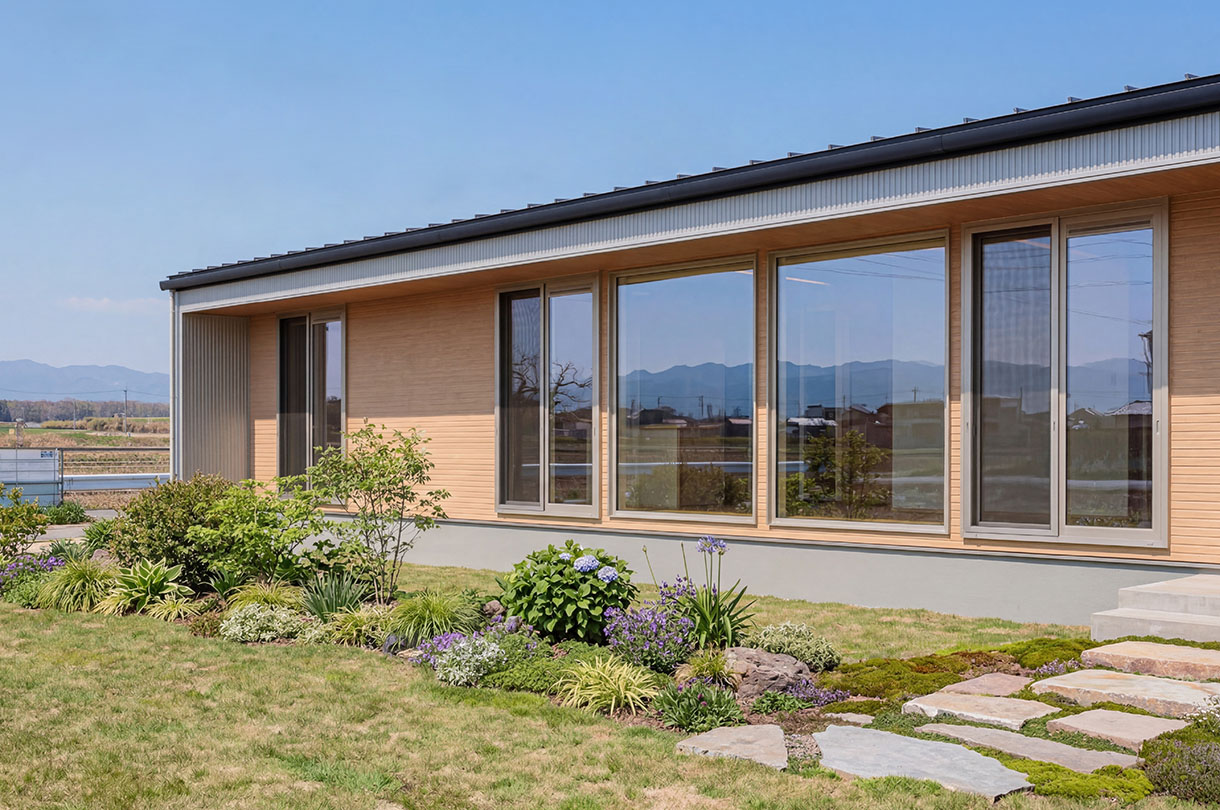 木調サイディングとガルバリウム屋根の組み合わせが、落ち着いた佇まいをつくっています。張り出した軒が外と内の境界をシームレスにつなぎ、大開口の向こうに広がる田園の景色が、そのまま暮らしの一部になります。