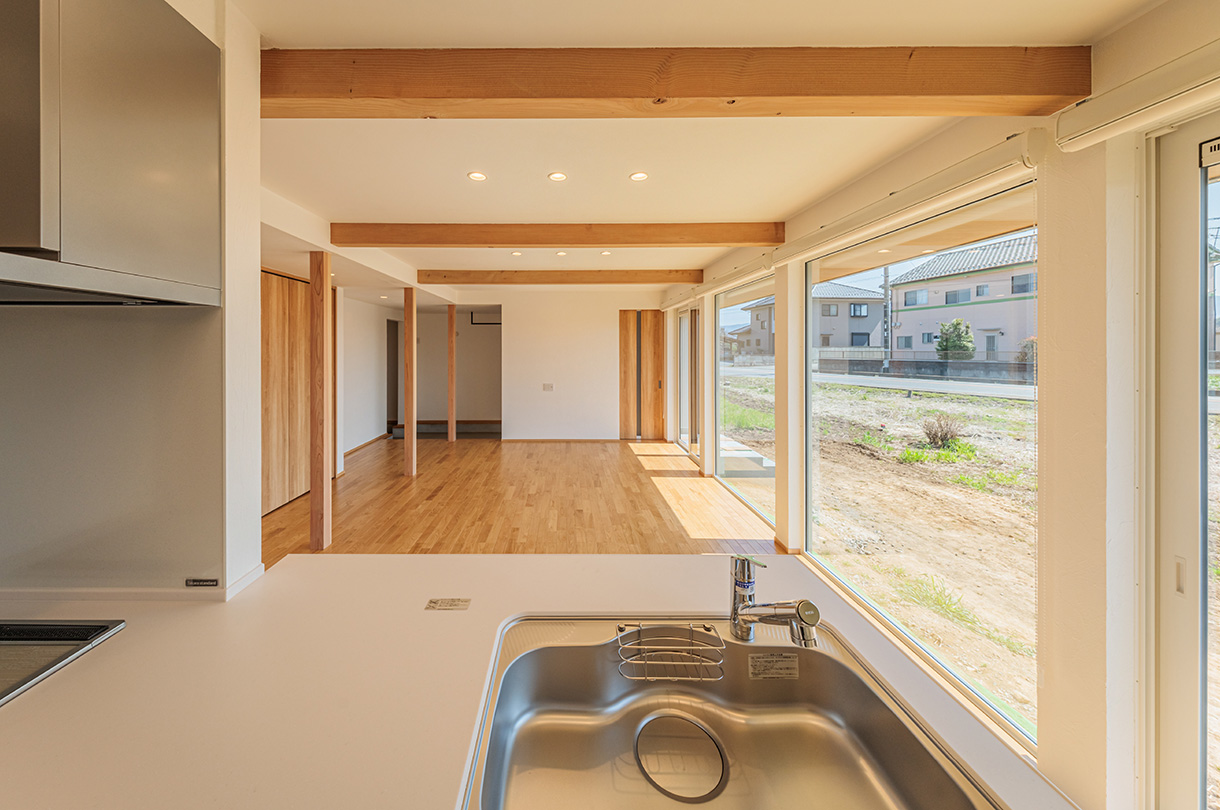 対面カウンターキッチンに立つと、ダイニング・リビング・土間、そして大開口の向こうまで視線が一直線に抜けます。料理をしながら家族の動きが自然に目に入る。その安心感が、日々の暮らしをすこし豊かにします。