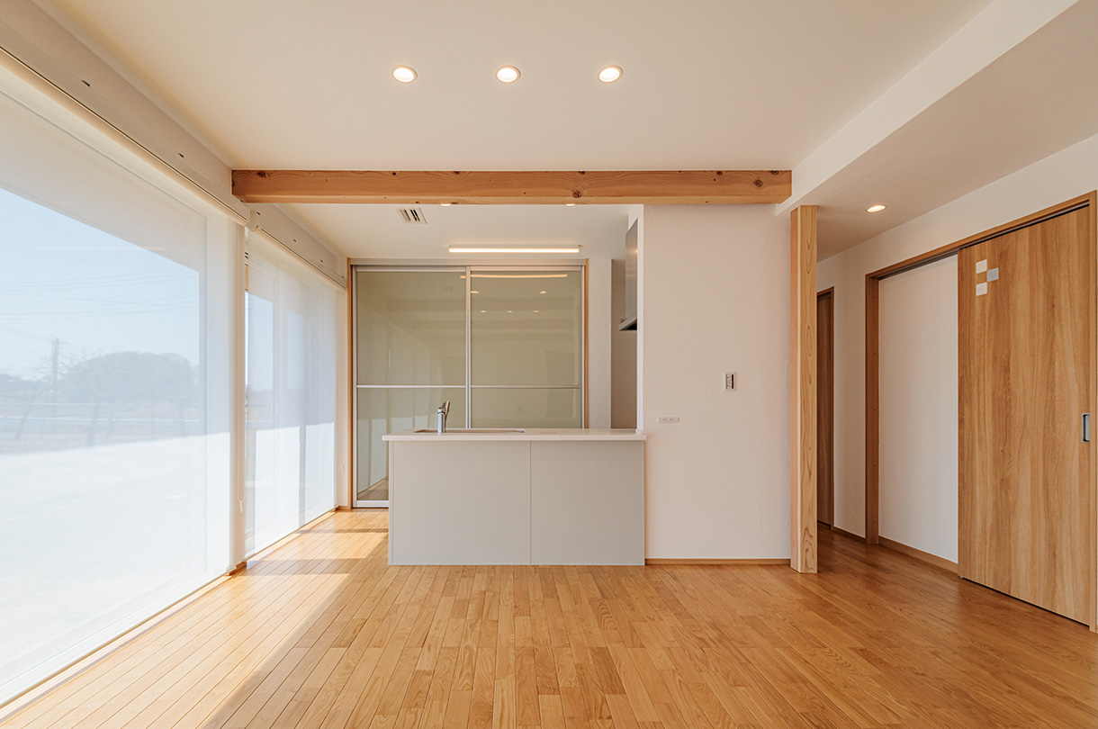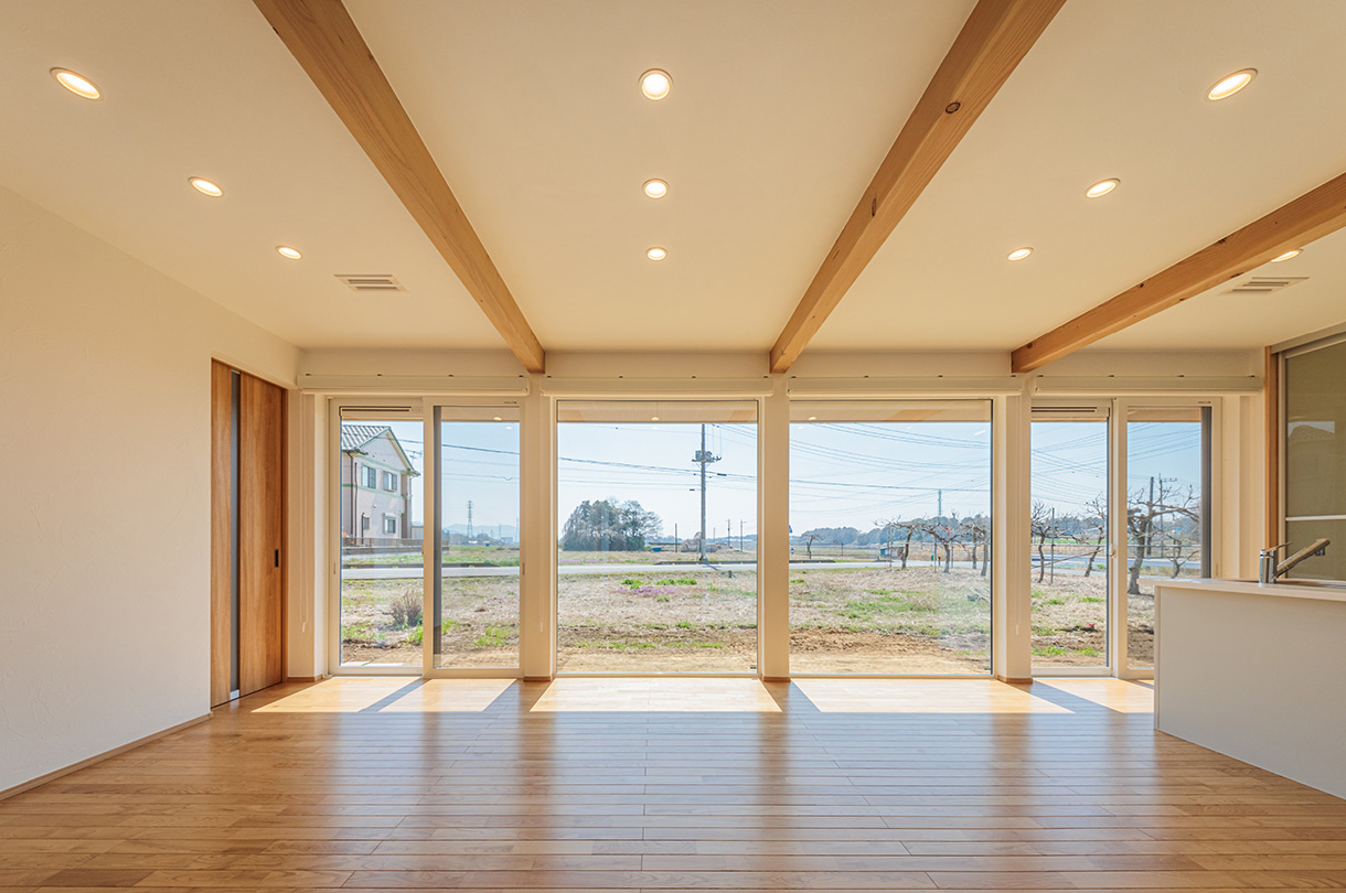 家族も自然も、ひとつになれる空間をつくりたい——そんなお施主様の想いを形にしたのが、このLDKです。梁を見せた天井、足に馴染む無垢フローリング。大開口サッシから田園の光が差し込み、家族の気配がどこからでも届く、のびやかな空間になりました。
