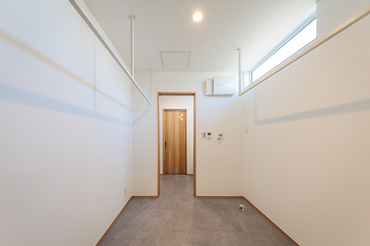 洗面、脱衣、収納がゆるやかにつながるサニタリーゾーン。朝の身支度も洗濯の流れも、動きが途切れない配置にしました。