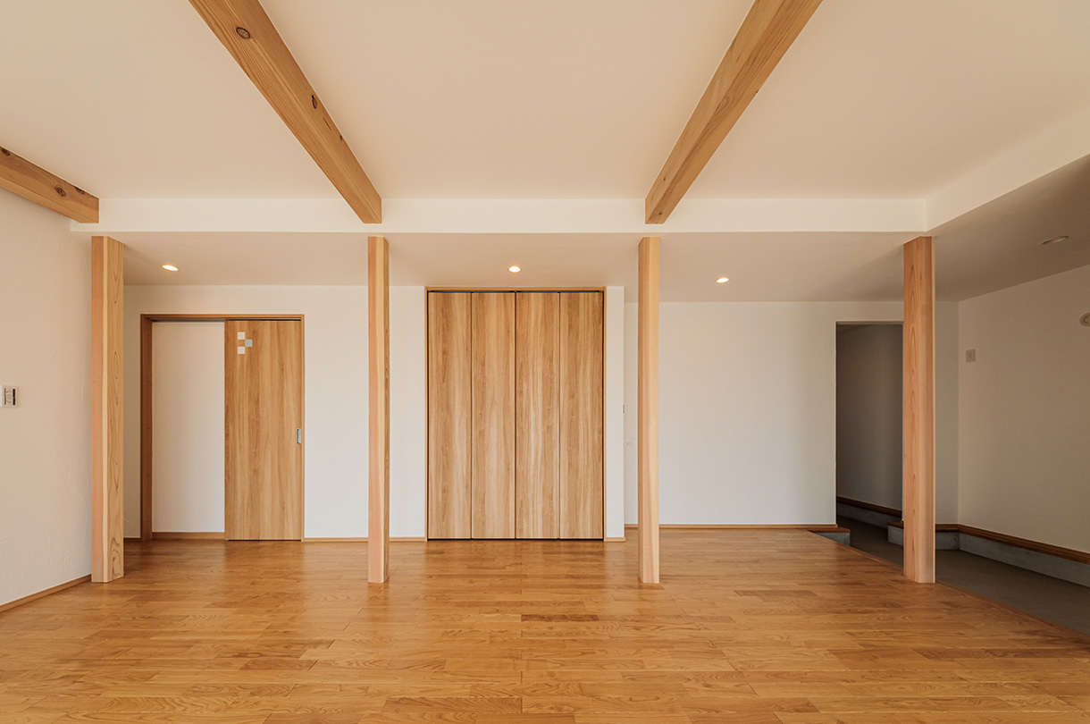 ・梁現し天井と無垢フローリングが生む、素材感のある大開口リビング